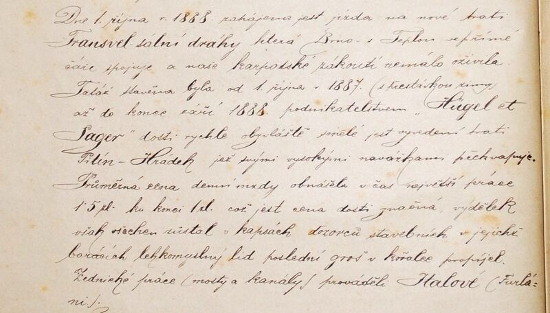 Popis: Zápis o stavbě Vlárské dráhy ve školní kronice učitelem Františkem Prokopem