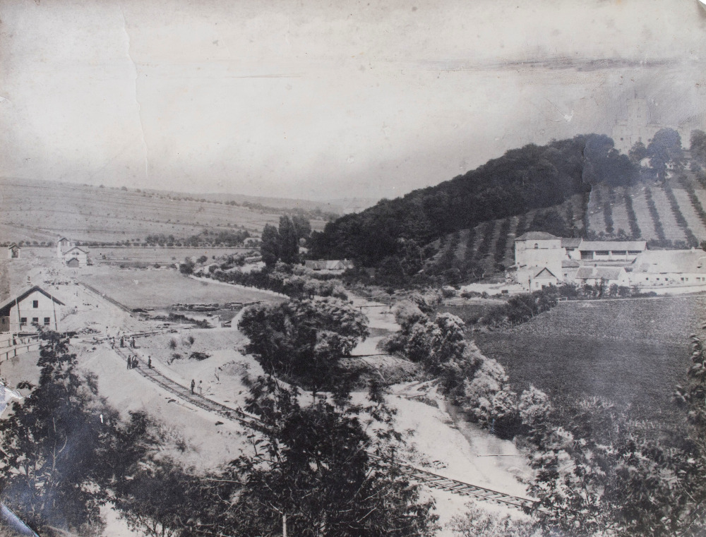 Popis: Stavba Vlárské dráhy v Bojkovicích (před rokem 1888)